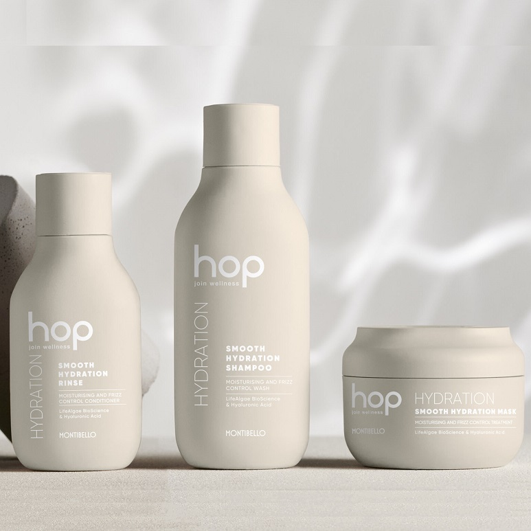 HOP Smooth Hydration. Moisturising and anti-frizz routine that strengthens hair and helps tame dry, unruly and/or frizzy hair, enriched with hyaluronic acid, an active ingredient with intense moisturising power that improves elasticity, controls frizz and restores softness and manageability.